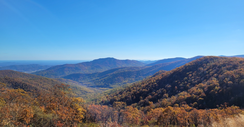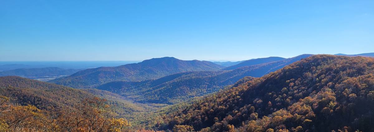 Standing on the Catoctin Greenstone of Wildcat Mountain looking west. Catoctin Greenstone also sits atop the high ridges of Mt. Marshal on the horizon. The whole scene is part of the Blue Ridge Anticlinorium.
