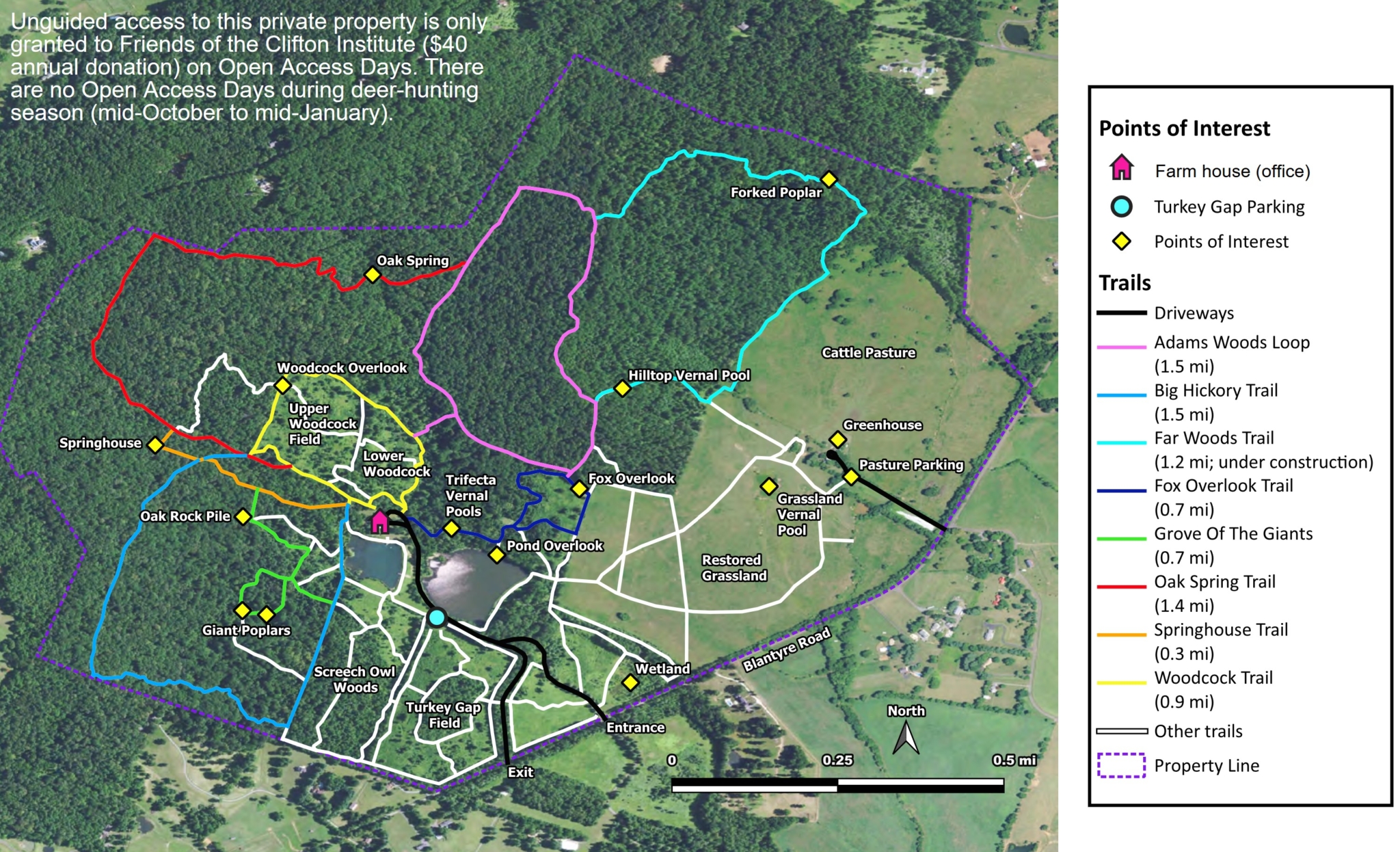 Report violations by emailing info@cliftoninstitute.org or calling 540-341-3651. We reserve the right to deny access to this property to anyone who does not obey the rules or is otherwise disruptive to our field station operations.