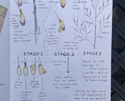 Co-Director Eleanor Harris is a passionate nature journaler and she runs quarterly nature journaling meetups here at the Clifton Institute to help people develop their nature journaling skills and meet other nature journalers in the area. These meetups are meant for everyone, whether you have been nature journaling for years or have never nature journaled before but want to try it out. You can find upcoming nature journaling meetups on our calendar here. You can also use the filter on our website calendar to search for nature journaling events.