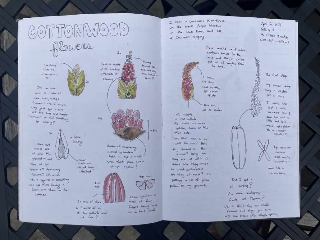Eleanor periodically emails a list of interested nature journalers to spend an afternoon sketching together here at Clifton. Email Eleanor to be added to that list.