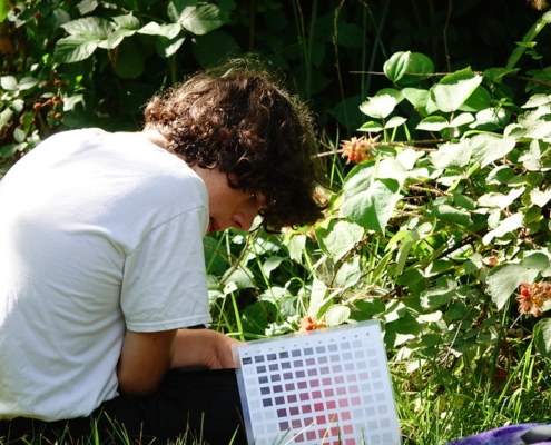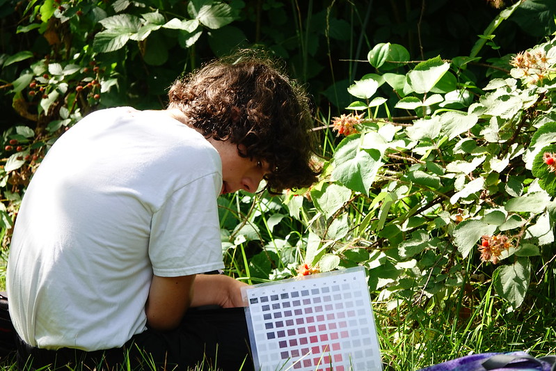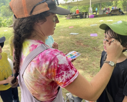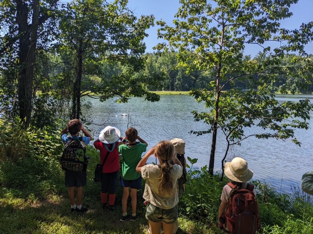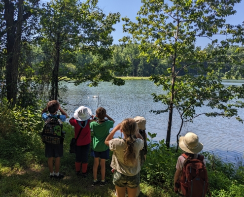 Each day at Young Naturalists camp, children will explore the field station with our naturalists and learn about the plants and animals that live in the northern Virginia Piedmont. We will focus on different topics each day of each week (trees, wildflowers, beetles, fungi, etc.), so you can sign up for both weeks and still learn new things! Each day begins with a Morning Workshop where campers dive deep into the subject for the day, which prepares them for the rest of the morning which is spent exploring through the lens of what they learned earlier. After a picnic lunch on the front lawn, students are given the chance to cool down by playing in the hose before getting ready for Afternoon Choices. Afternoon Choices give campers agency in shaping their camp experience by picking what they prefer to do from a set of 3 options which are different each day. These could include things like water coloring at the beaver pond, hiking to the lichen rocks, playing camouflage, or foraging for wine berries! Lastly, we give each camper a journal and conclude each day by sitting and reflecting in small groups before ending with Closing Circle–a chance to share what we liked, what we were challenged by, and things we’re looking forward to.